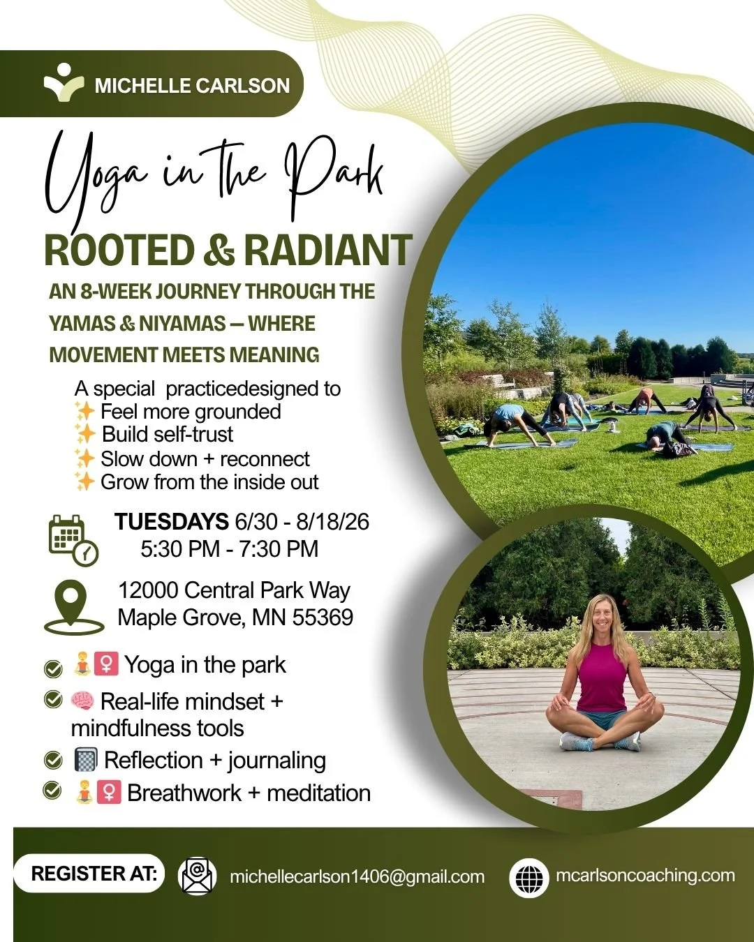 Rooted & Radiant is an 8-week yoga and mindfulness experience designed to help you reconnect to yourself—physically, mentally, and emotionally. Each week, we gather in nature to move through a grounding yoga practice, followed by a guided workshop exploring the Yamas and Niyamas—ancient yogic principles that offer practical tools for living with clarity, intention, and purpose. As a passionate yoga teacher and holistic tlife coach, I created this space to go beyond the mat—to help you build self-awareness, strengthen your mindset, and cultivate a deeper sense of trust and connection within yourself. Through movement, breathwork, reflection, and real-life integration, this journey is an invitation to slow down, tune in, and grow from the inside out. Options: Yoga practice only, Workshop only or BOTH. Limited to 30 spots!